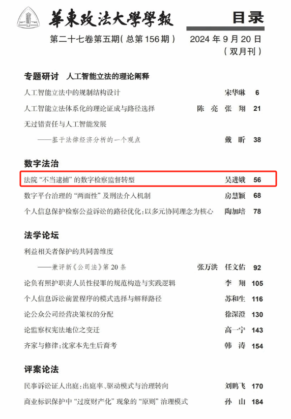 近日,我院吴进娥老师于《华东政法大学学报》2024年第5期发表题为《法院“不当逮捕”的数字检察监督转型》学术论文。《华东政法大学学报》是由上海市教育委员会主管、华东政法大学主办的中文期刊,为CSSCI来源期刊、CLSCI来源期刊、中文法律核心期刊、中国人文社会科学法学核心期刊、全国高校权威社科期刊。