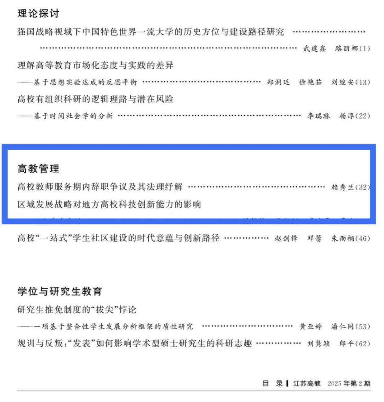 我院赖秀兰老师于《江苏高教》2025年第2期发表题为《高校教师服务期内辞职争议及其法理纾解》的学术论文。《江苏高教》创刊于1981年1月,由江苏省教育厅主管、江苏教育报刊总社主办,自1992年以来,历次均被评为“全国中文核心期刊”“中国人文社会科学核心期刊”“中文社会科学引文索引来源期刊(CSSCI来源期刊)”。