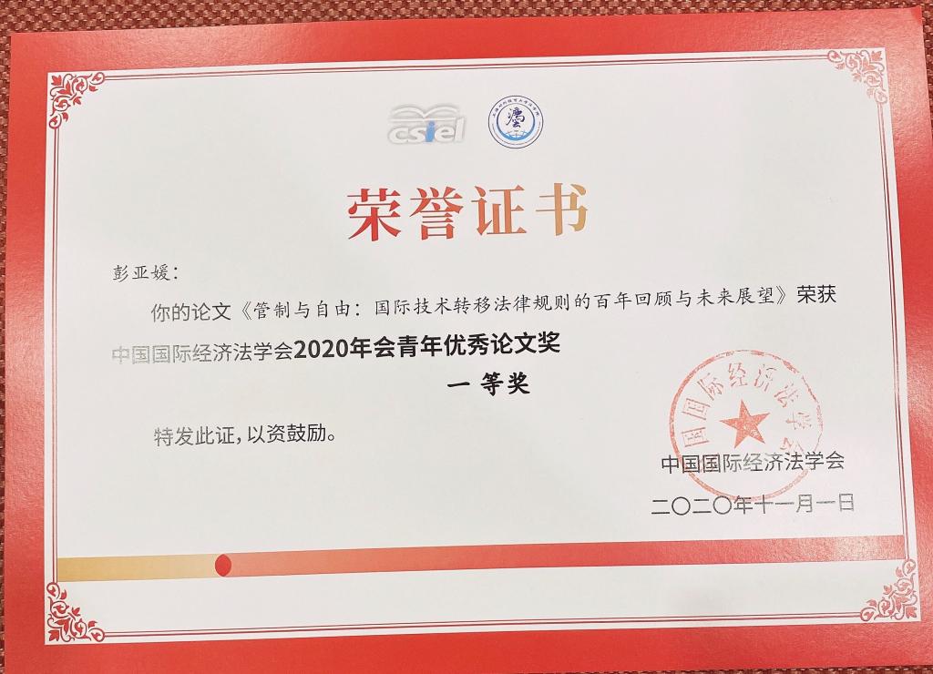 2020年10月31日-11月1日,中国国际经济法学会2020年年会暨学术研讨会于上海对外经贸大学举行。全国政协常委、民建中央副主席、上海市政协副主席、上海对外经贸大学yl7703永利集团名誉院长周汉民,上海对外经贸大学党委副书记、纪委书记许玫,WTO上诉机构前主席、清华大学国际争端解决研究院院长张月姣,中国国际贸易促进委员会法律事务部副部长郑伟,中国国际经济法学会会长曾华群教授及上海司法局副局长罗培新教授等领导和嘉宾出席本次年会。来自商务部、外交部、贸促会、清华大学、复旦大学、浙江大学、南京大学、南开大学、中国人民大学、中国社会科学院国际法研究所、中国商务出版社等91个国家机关、高等院校以及法律实务界的近300名专家、学者参与学术研讨。我院教师彭亚媛受邀参会并做分论坛主旨发言。彭亚媛老师的论文《管制与自由:国际技术转移法律规则的百年回顾与未来展望》,荣获中国国际经济法学会2020年青年优秀论文一等奖。