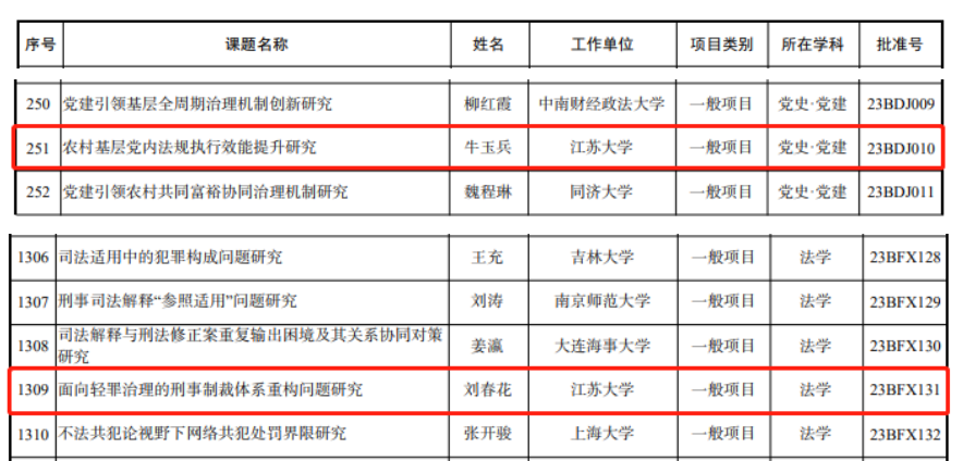近日,全国哲学社会科学工作办公室公布2023年国家社会科学基金年度项目和青年项目立项结果。我院牛玉兵老师主持申报的《农村基层党内法规执行效能提升研究》、刘春花老师主持申报的《面向轻罪治理的刑事制裁体系重构问题研究》获批为2023年度国家社科基金一般项目立项。