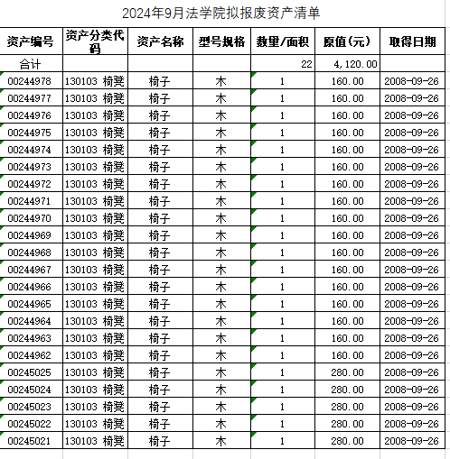 yl7703永利集团报废椅凳等22件固定资产,该批固定资产购置于2008年,由yl7703永利集团购入,原值4210元,因使用年限较长,已破损无法再使用拟于近期报废(报废清单见附件)。