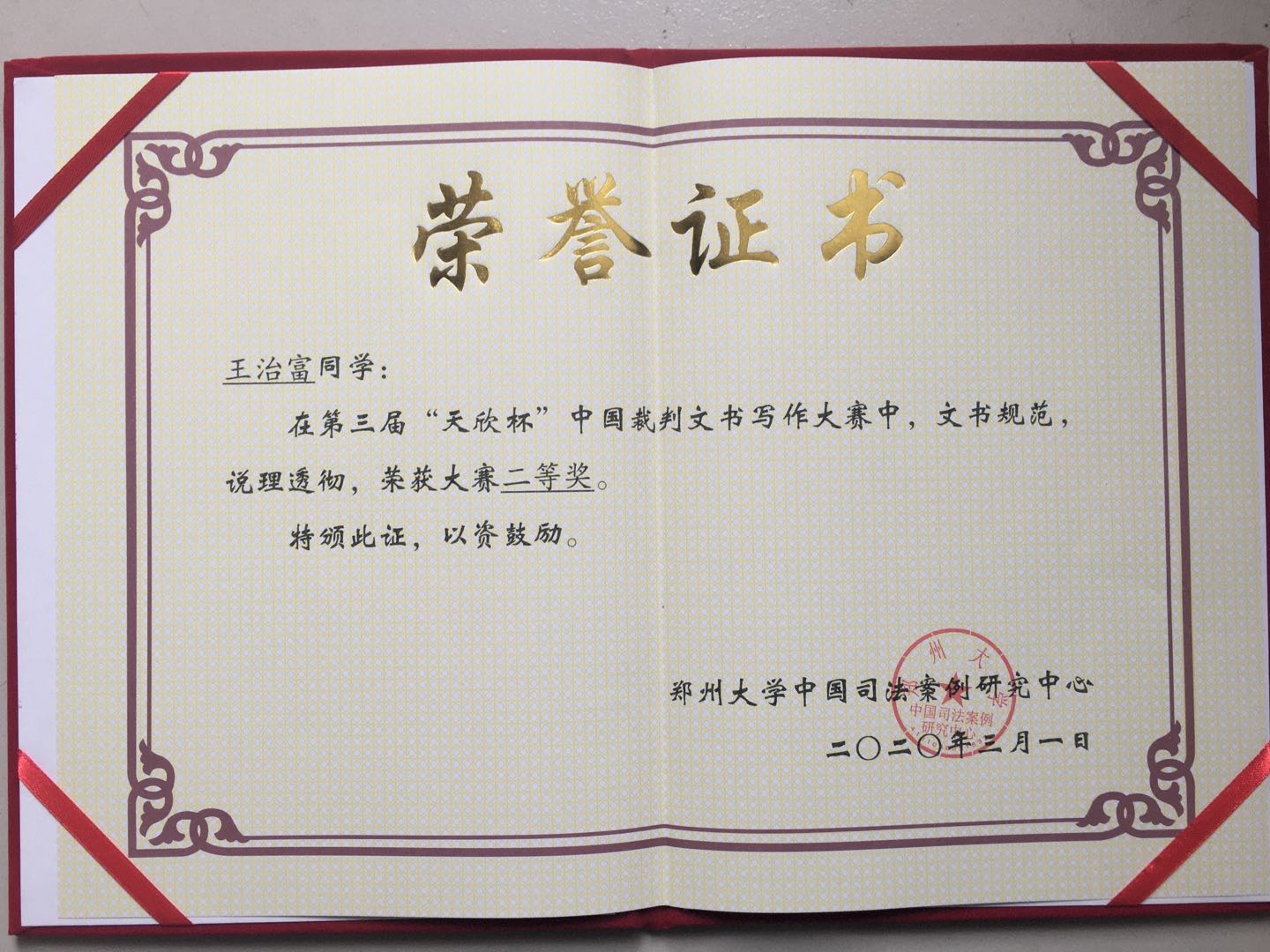 第三届“天欣杯”中国裁判文书写作大赛二等奖
