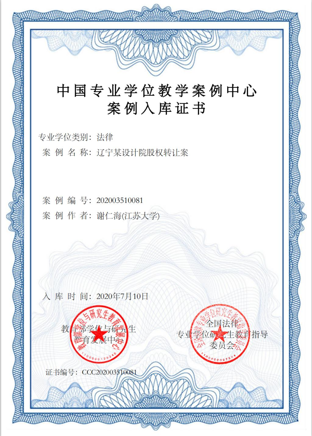 谢仁海——中国专业学位教学案例中心案例入库证书