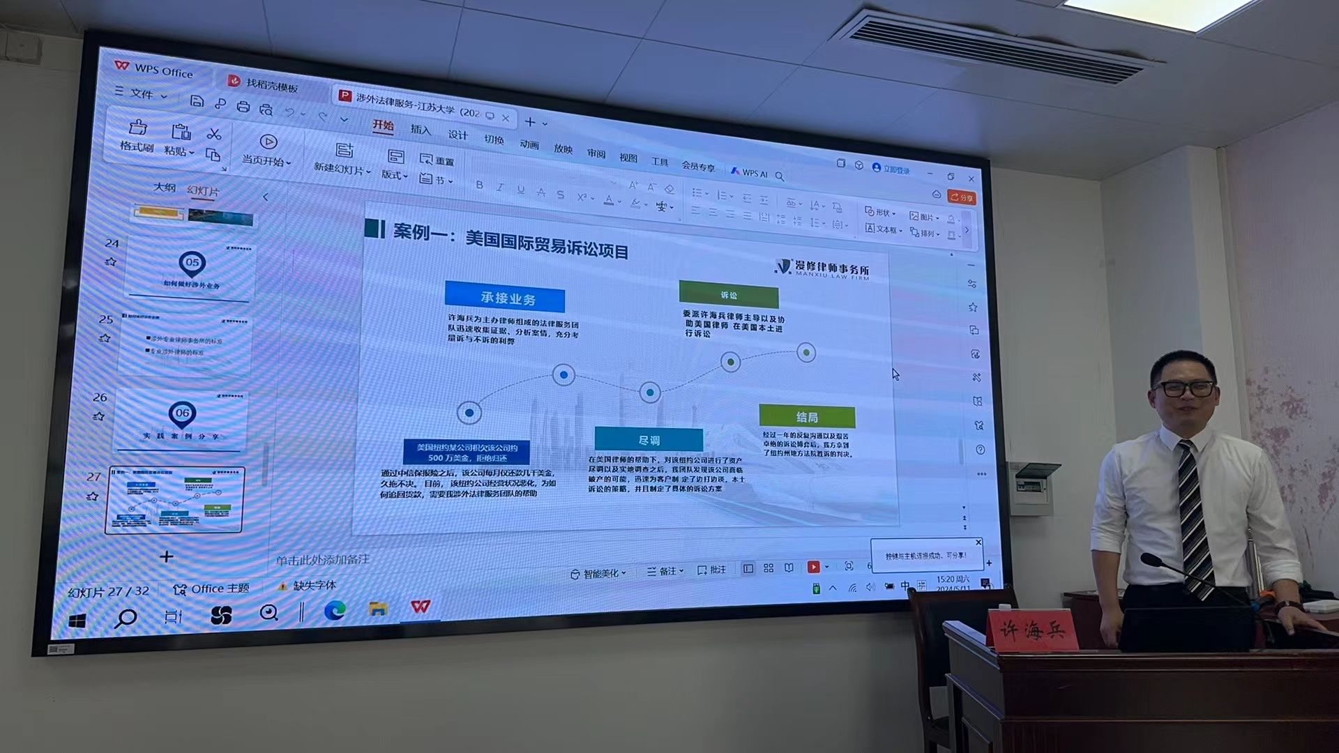 近日,路韬·三江法学论坛第61期在yl7703永利集团1620成功举办。本期论坛由漫修律师事务所许海兵律师主讲,主题为“‘一带一路’背景下的中国律师涉外法律实务”。yl7703永利集团副院长方晓霞副教授、唐华彭副教授等师生参加了讲座。本次讲座由yl7703永利集团院长李炳烁教授主持。