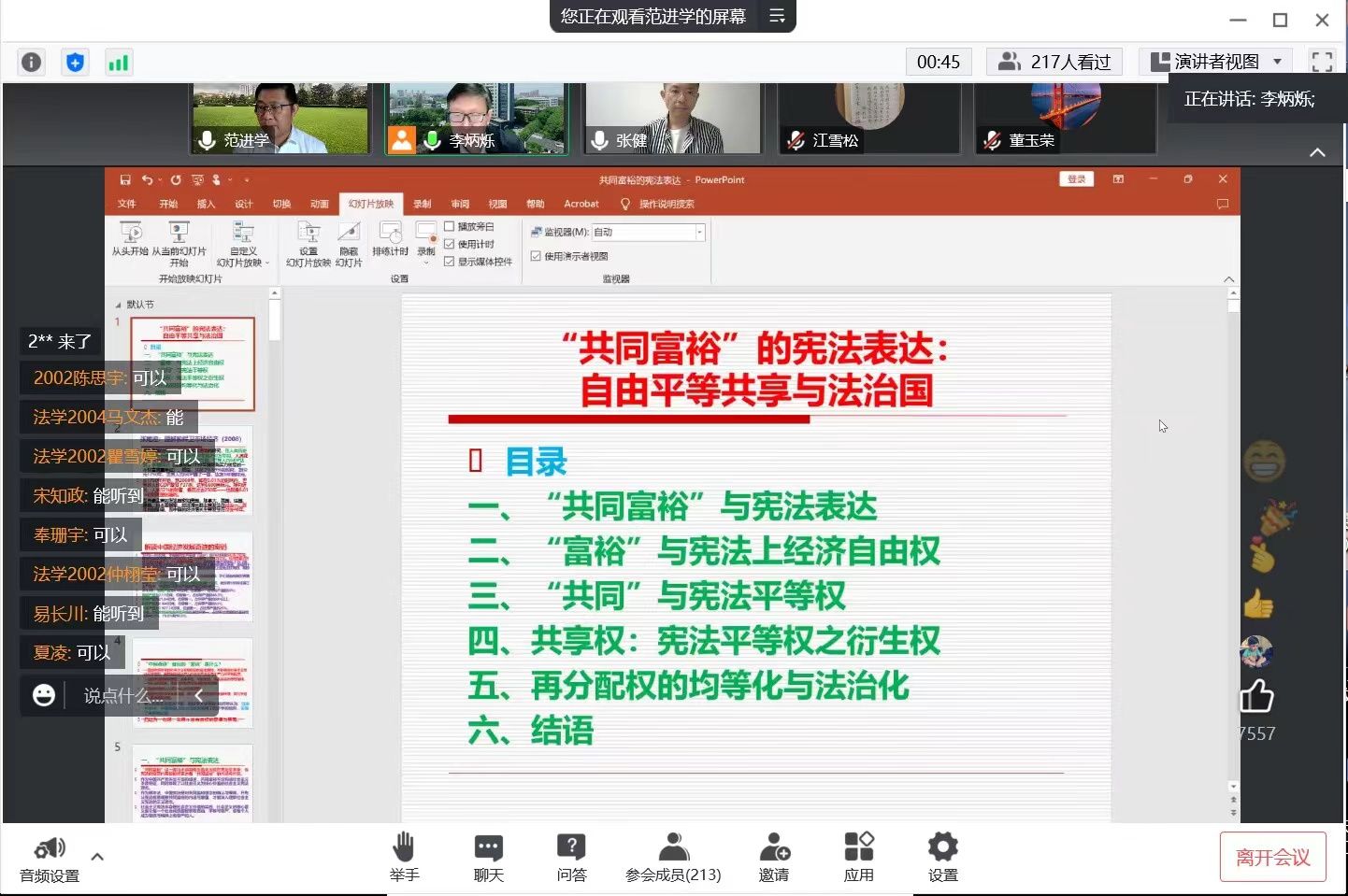 10月21日,yl7703永利集团海然基金高端学术讲座系列在线上进行。本场讲座由上海交通大学凯原yl7703永利集团范进学教授主讲,主题是《共同富裕的宪法表达》。yl7703永利集团李炳烁院长主持讲座。yl7703永利集团肖建飞教授、江雪松教授、唐华彭副教授、董玉荣副教授、尚清锋副教授、张健副教授以及校内外近300名研究生与本科生参与了本次讲座。