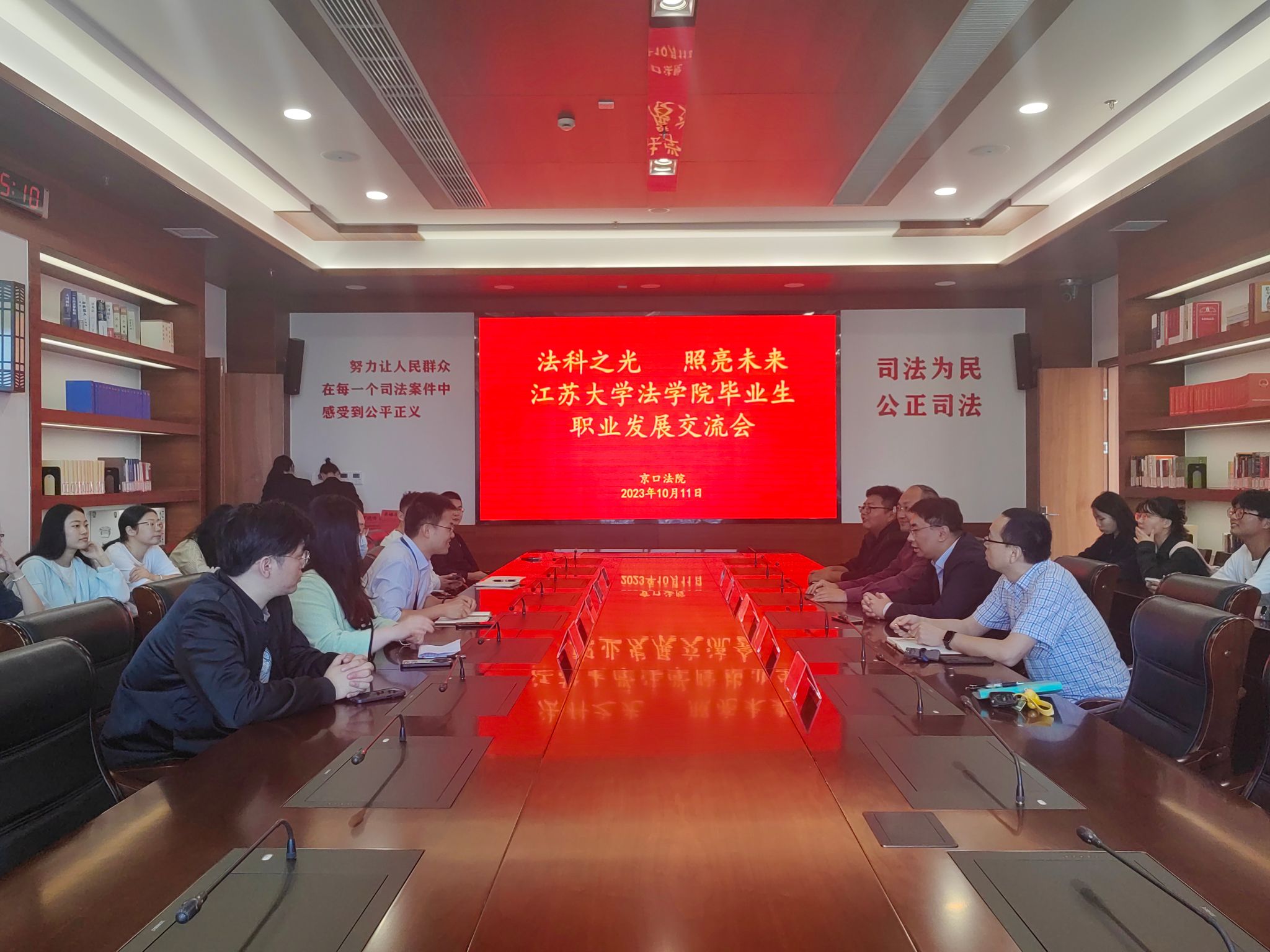 王鹏一行参观考察了京口区人民法院,并与孙文等人进行了现场交流。交流会上,孙文全面介绍了法院的发展状况和人才需求情况。谏壁法庭副庭长束放成,刑庭法官助理赵舒,综合办法官助理蒋欢星就择业选择、职业发展、未来规划、理论学习等方面进行了经验分享。王鹏对京口区法院与yl7703永利集团共同开展“法院开放日”专项活动表示感谢,并介绍了yl7703永利集团在事业发展、人才培养等方面的主要举措。随后,双方就大学生就业创业、人才培养、产学研合作等方面进行了深入的交流。