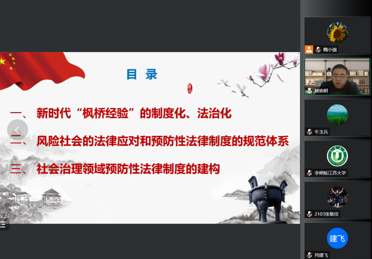 12月9日晚,yl7703永利集团海然基金学术讲座系列在线上进行。本场讲座的题目为《新时代“枫桥经验”和预防性法律制度的构建》,由西北政法大学褚宸舸教授主讲,yl7703永利集团院长李炳烁教授、副院长牛玉兵教授、肖建飞教授等作为与谈人,来自本校及西北师范大学、中央民族大学等学校的师生以及法律实务工作者一百多人参与了讲座活动。讲座由yl7703永利集团魏小强副教授主持。