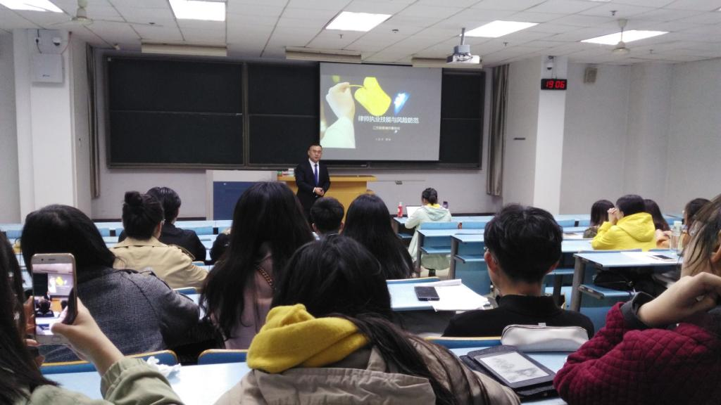 王律师以“律师执业技能与风险防范”为主题,从律师的性质和职责切入,结合自己的执业经历,以刑事辩护为例,讲授了求情辩、伸冤辩、定性辩、实体辩、量刑辩、程序辩、死刑辩等辩护技巧。同时还对一些影响性案件的辩护策略及司法现状进行了解读,使听众对刑辩律师的责任与担当有了新的认识。随后,王律师讲述了律师职业所面临的民事赔偿、行政处罚、刑事责任、行业处分等职业风险。他认为,法科生学习法律实务需要明师指点,得勤学苦练、精通规则,具有自我防范意识,并鼓励在座的同学们要学法、懂法、传法、用法,保护自己,维护他人,造福社会。