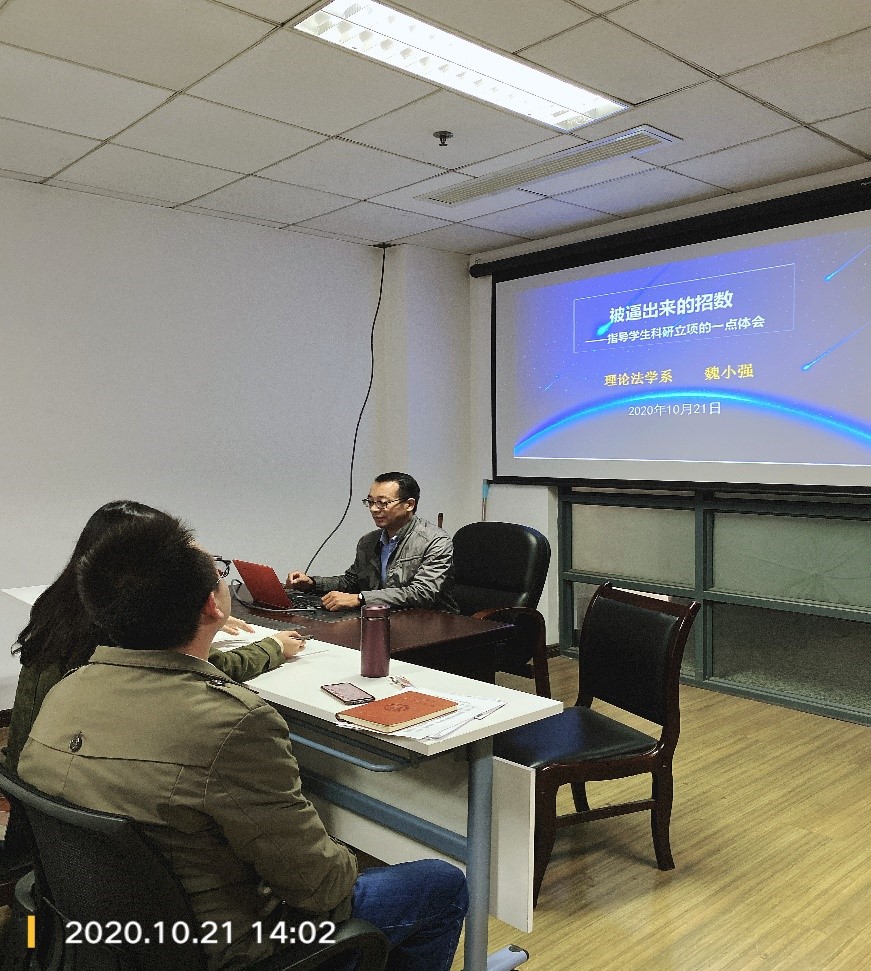 “大学生科研课题指导”是本科教学的重要环节。2020年10月21日,理论法学系举行主题教研活动,就该问题进行深入研讨。魏小强副教授作主题报告“被逼出来的招数——指导学生科研立项的一点体会”,他结合自己指导大学生科研立项的经历,总结了在学生遴选、科研主题确定、申报书撰写指导等方面的优秀经验,为提升大学生科研课题指导效果提供了有效路径。报告结束后,牛玉兵、宫宝芝、孙建国、唐华彭、傅华忠等教师相继就该问题发表意见,取得了一系列共识。