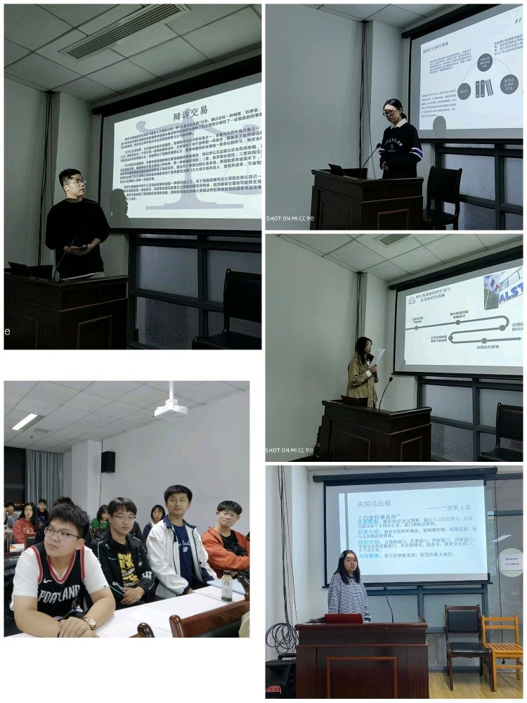 阅读报告分两个单元进行:第一单元报告从微观角度出发,以“美国陷阱下的博弈”为报告题目,从皮耶鲁齐被捕事件入手,分析美国司法部如何对阿尔斯通编织法网,以及主导美国司法的力量。第二单元报告从宏观角度出发,以“美国法律体系背后的经济利益链”为报告题目,从美国《反海外腐败法》的出台与实施入手,剖析美国软实力的全球运用、诉辩交易中的效率与公正、监狱运行的成本收益与罪犯人权保护,以及针对美国经济暗战的法律应对等五个问题。两个单元汇报结束后,张国翔与咸舒竟两位同学表达了不同的观点。