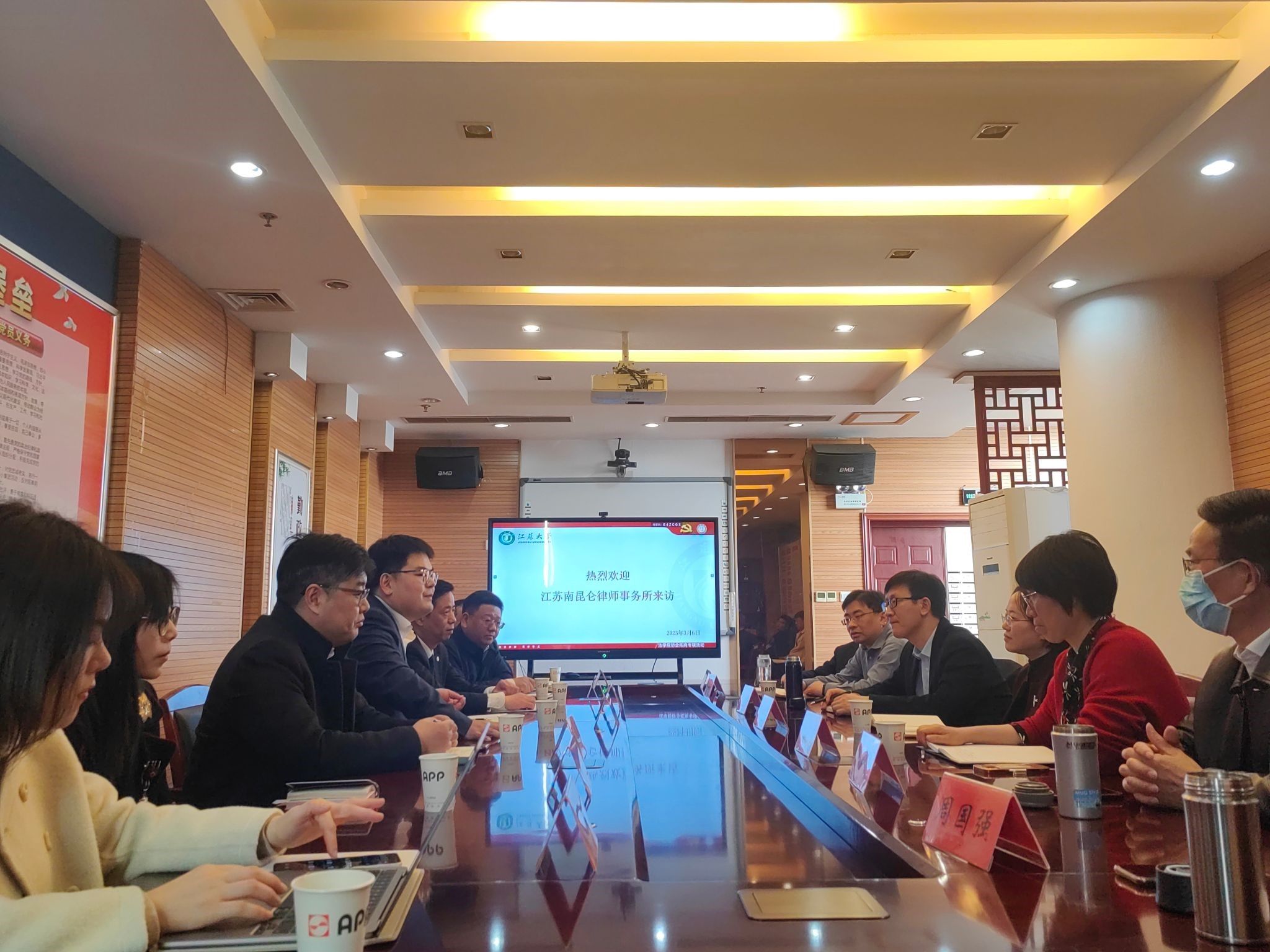 In the afternoon of March 6, Wang Pei, director of Jiangsu South Kunlun Law Firm, Xu Shike, deputy director and secretary of the party branch, Yuan Changjie, deputy director and Dou Jian, deputy director of the firm, came to the college for exchange and research. Zhu Lingping, secretary of the party committee of the law school, Li Bingshuo, dean and deputy secretary of the party committee, Fang Xiaoxia, vice dean, Wang Peng, deputy secretary of the party committee and vice dean, etc. warmly received Wang Pei and his party in the meeting room of the college.